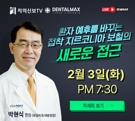 주소 : 서울시 성동구 광나루로 257(송정동) 대한치과의사협회 회관 3층 | 등록번호 : 서울, 아52234 | 등록일자 : 2019.03.25 | 발행인 직무대행 마경화 | 편집인 이석초 대표전화 : 02-2024-9200 | FAX : 02-468-4653 | 편집국 02-2024-9210 | 광고관리국 02-2024-9290 | Copyright © 치의신보. All rights reserved.