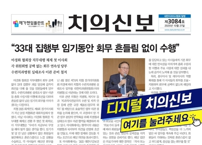 주소 : 서울시 성동구 광나루로 257(송정동) 대한치과의사협회 회관 3층 | 등록번호 : 서울, 아52234 | 등록일자 : 2019.03.25 | 발행인 직무대행 마경화 | 편집인 이석초 대표전화 : 02-2024-9200 | FAX : 02-468-4653 | 편집국 02-2024-9210 | 광고관리국 02-2024-9290 | Copyright © 치의신보. All rights reserved.