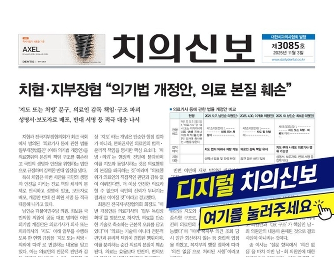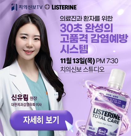 주소 : 서울시 성동구 광나루로 257(송정동) 대한치과의사협회 회관 3층 | 등록번호 : 서울, 아52234 | 등록일자 : 2019.03.25 | 발행인 직무대행 마경화 | 편집인 이석초 대표전화 : 02-2024-9200 | FAX : 02-468-4653 | 편집국 02-2024-9210 | 광고관리국 02-2024-9290 | Copyright © 치의신보. All rights reserved.
