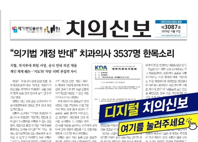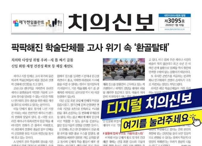 주소 : 서울시 성동구 광나루로 257(송정동) 대한치과의사협회 회관 3층 | 등록번호 : 서울, 아52234 | 등록일자 : 2019.03.25 | 발행인 직무대행 마경화 | 편집인 이석초 대표전화 : 02-2024-9200 | FAX : 02-468-4653 | 편집국 02-2024-9210 | 광고관리국 02-2024-9290 | Copyright © 치의신보. All rights reserved.