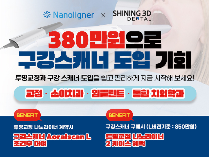 또 투명교정 나노라이너와의 콜라보 행사도 진행된다. ‘교정 전문의가 하는 투명교정, 교정 전문의를 위한 투명교정’으로 성장해온 투명교정 나노라이너와 국내 출시한 지 4년여 동안 수백 개의 치과에서 활용하며 임상적으로 검증된 Aoralscan의 동시 도입 기회를 제공한다.
