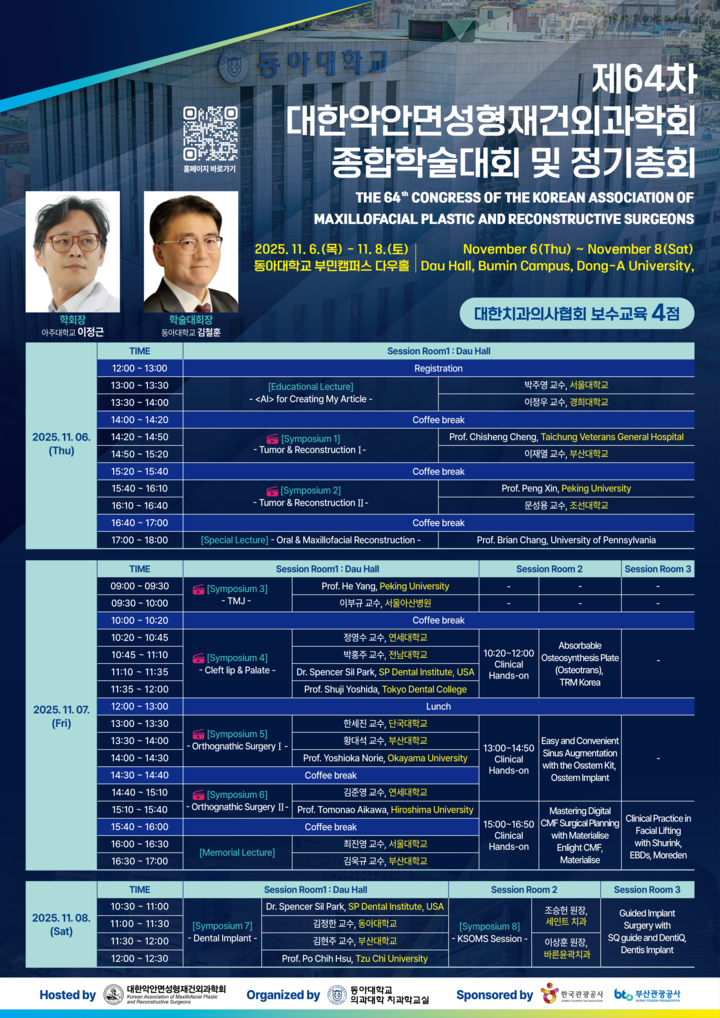 대한악안면성형재건외과학회(이하 악성재건학회)가 ‘제64차 대한악안면성형재건외과학회 종합학술대회 및 정기총회’를 오는 11월 6~8일 동아대 부민캠퍼스 다우홀에서 개최한다.