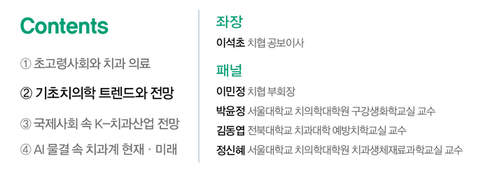 그간 우리나라 치과계는 임플란트, 디지털, 영상 분야에 있어 전 세계 최고 선두 주자로 그 위용을 떨쳐 왔다. 이 가운데 기초치의학은 오랜 기간 국내 치과 임상과 산업의 뿌리를 형성하며 치과계 기둥 역할을 톡톡히 해왔다. 실제로 기초 연구를 통해 밝혀진 질환의 병태생리학적 기전은 새로운 치료 전략을 가능케 했으며, 나아가 치료제 개발, 진단 기술, 바이오마커 발굴, 정밀치의학 등 산업화로도 확장되고 있다.