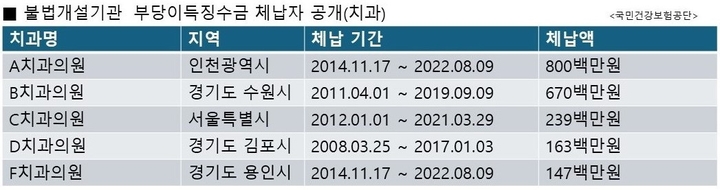 이 가운데 가장 높은 체납액은 인천 소재 A치과로 지난 2014년 11월부터 2022년 8월까지 총 8억 원의 부당이득금을 납부하지 않았다. 반대로 가장 규모가 작은 곳은 경기도 용인시의 F치과로 2014년 11월부터 2022년 8월까지 1억4700여만 원을 체납했다. 덧붙여 이들 5개 불법개설치과의 총 체납액은 약 20억 원에 달한다.