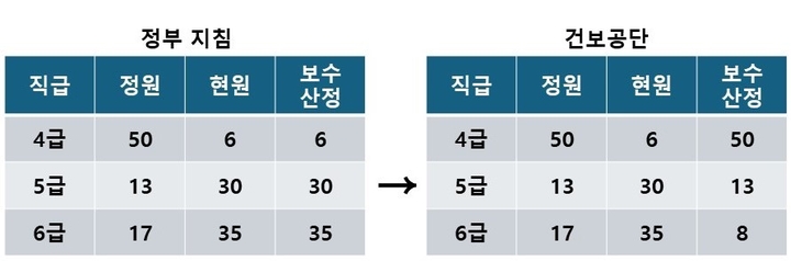 국민권익위에 따르면, 건보공단은 5‧6급 현원에 대해 상위 직급인 4‧5급의 보수를 적용하는 편법을 사용해 인건비를 편성했다. 이로써 과다 편성한 인건비만 지난 2016년부터 2023년까지 8년간 5995억 원에 달하는 것으로 알려졌다.