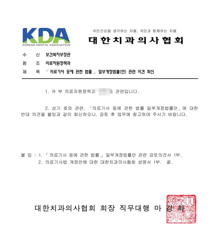 이어 치과의사 회원들의 반대 서명은 10월 27일부터 11월 5일까지 회원 전체 문자 안내와 구글폼을 통해 참여가 이뤄졌고, 총 3537명이 개정안에 반대 의사를 표시했다. 또 치협은 명확한 회원 여론을 공유하는 취지에서 복지부에 반대 서명자 명단과 기존 성명서를 첨부해 지난 7일 추가 전달했다.