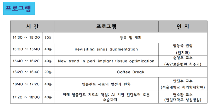 구체적으로 ▲창동욱 원장(윈치과)의 ‘Revisiting sinus augmentation’ ▲송영우 교수(중앙보훈병원 치주과)의 ‘New trend in peri-implant tissue optimization’ ▲안진수 교수(서울대학교 치의학대학원)의 ‘임플란트 재료의 발전과 변화’ ▲변수환 교수(한림대학교 성심병원)의 ‘미래 임플란트 치료의 핵심: AI 기반 진단부터 로봇 수술까지’ 등이 열린다.