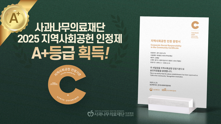 사과나무의료재단이 보건복지부와 한국사회복지협의회가 공동 주관하는 ‘2025년 지역사회공헌 인정제’에서 A+등급을 받으며 인정기관으로 선정됐다.