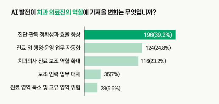 AI 발전이 치과 의료진의 역할에 미칠 영향에 대해서는 ‘진단·판독 정확성과 효율성 향상’이 39.2%(196명)로 가장 많았다. 이어 ‘진료 외 업무 자동화’(24.8%, 124명), ‘치과의사 진료 보조 확대’(23.2%, 116명), ‘보조 인력 업무 대체’(7%, 35명), ‘진료 영역 축소’(5.6%, 28명), 기타(0.2%, 1명) 등이었다.