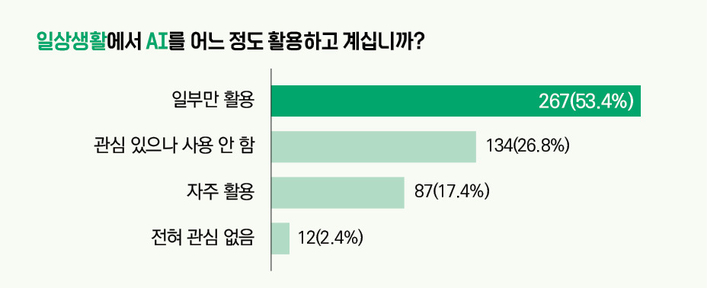 실제로 10명 중 7명은 일상생활 속에서 이미 AI를 활용하고 있었다. 설문 결과 ‘일부 활용하고 있다’는 이들이 53.4%(267명)로 가장 많았다. 이어 ‘관심 있으나 사용 안 함’(26.8%, 134명), ‘자주 활용’(17.4%, 87명), ‘전혀 관심 없고, 사용 안 함’(2.4%, 12명) 순으로 집계됐다.