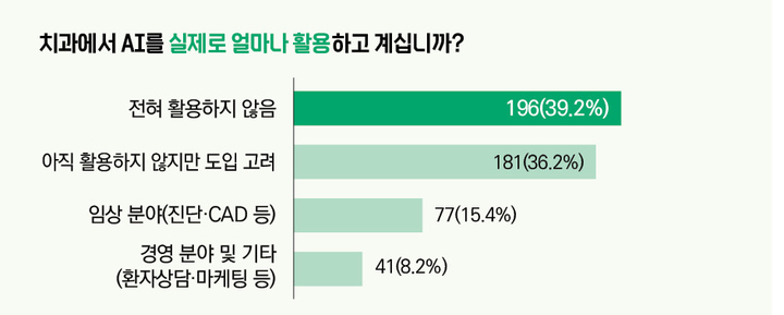 이어진 응답으로는 ‘아직 활용하고 있지 않지만, 도입을 고려하고 있다’(36.2%, 181명), ‘임상 분야에 활용하고 있다’(15.4%, 77명), ‘경영분야에 활용하고 있다’(8.2%, 41명), 기타(1%, 5명) 등으로 나타나, 결과적으로 개원의 10명 중 7명은 치과에서 AI를 활용하지 않고 있는 것으로 보인다.