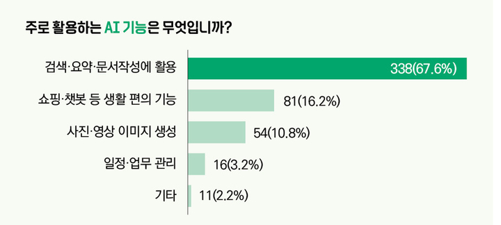 오히려 응답자 다수는 평소 AI를 활용하더라도 검색 또는 문서 작성에 그친 것으로 나타났다. 주로 활용하는 AI 기능은 무엇이냐는 질문에 응답자들은 ‘검색·요약·문서 작성’이 67.6%(338명)으로 가장 많았다. 이어 ‘쇼핑·챗봇 등 생활 편의 기능’(16.2%, 81명), ‘사진, 영상 등 이미지 생성’(10.8%, 54명), ‘일정·업무관리’(3.2%, 16명), 기타(2.2%, 11명) 순으로 집계됐다.