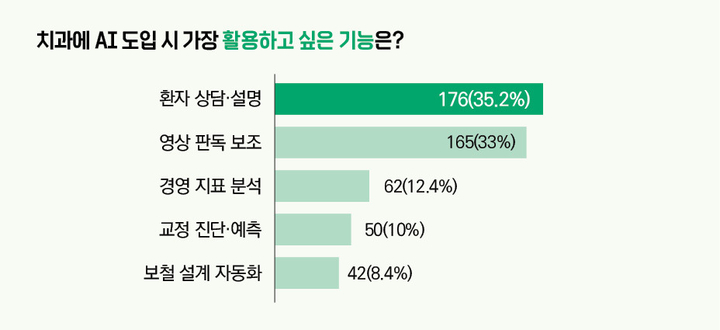 아울러 치과에 AI를 도입할 경우 어떤 기능을 가장 활용할 것인지에 대해서는 ‘환자 상담’을 35.2%(176명)로 가장 많이 꼽을 정도로 신환·구환 관리에 다소 고민인 모습이었다.