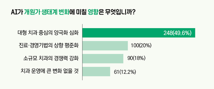 우선 응답자 중 49.6%(248명)가 AI가 현 개원가 생태계에 가장 크게 미칠 영향으로 ‘대형 치과 중심의 진료·경영 효율 양극화’를 꼽았다. 이어진 답변으로는 ‘진료·경영기법의 상향 평준화’(20%, 100명), ‘소규모 동네 치과의 경쟁력 강화’(18%, 90명), ‘치과 운영에 큰 변화가 없을 것’(12.2%, 61명), 기타(0.2%, 1명) 순으로 나타났다.