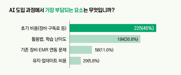 아울러 AI 도입 과정에서 크게 부담되는 요소에 대한 물음에는 ‘장비, 구독료 등 초기 비용’(45%, 225명)이 가장 많이 집계돼 경제적인 부문에서 근심이 가장 큰 것으로 확인됐다.