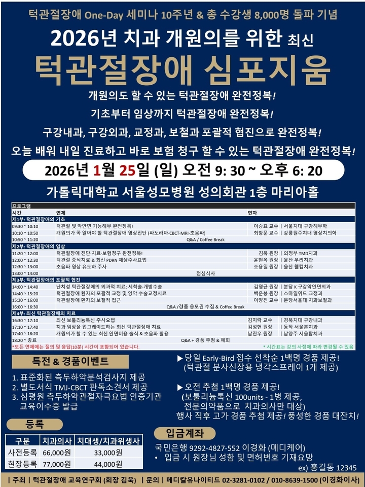 턱관절장애 One-Day 세미나 10주년 및 총 수강생 8천명 돌파 기념 ‘2026년 치과 개원의를 위한 최신 턱관절장애 심포지엄’이 오는 1월 25일 가톨릭대학교 서울성모병원 성의회관 1층 마리아홀에서 열린다.