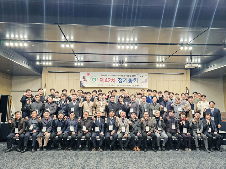 전남치대 총동창회는 ‘제42차 정기총회’를 지난 1월 17일 라마다플라자 충장호텔 대연회장에서 개최했다. 이날 총회에는 한상운 총동창회장, 고정태 전남대 치의학전문대학원장, 황윤찬 전남대 치과병원장을 비롯해 총동창회 임원진, 상임이사, 고문, 감사 등 내빈 70여 명이 참석해 자리를 빛냈다.