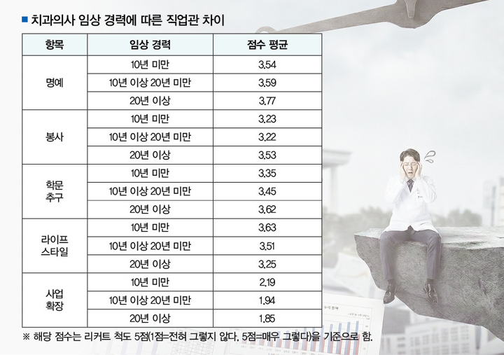 우선 주목할 점은 개원가 현실을 반영하는 경쟁 압력(Competitive Pressure) 수치였다. 전체 응답자의 절반이 넘는 57%(1101명)가 주변 치과와의 경쟁 압력이 높다(High)고 답해, 한국 치과계의 치열한 생존 환경을 수치로 증명했다. 특히 임상 경력은 직업 가치관을 가르는 결정적 변수였다. 세부적으로 임상 경력 20년 이상인 그룹은 명예(Prestige), 봉사(Service), 학문 추구(Scholarly Pursuit) 항목에서 저년차 그룹보다 통계적으로 유의미하게 높은 점수를 기록했다. 반면 경력 10년 미만인 젊은 치과의사들은 라이프스타일(Lifestyle)과 사업 확장(Business Expansion) 영역에서 고년차 그룹보다 월등히 높은 점수를 보였다. 젊은 치과의사들이 병원 운영과 워라밸을 생존을 위한 필수 역량으로 인식하고 있음을 보여준다.