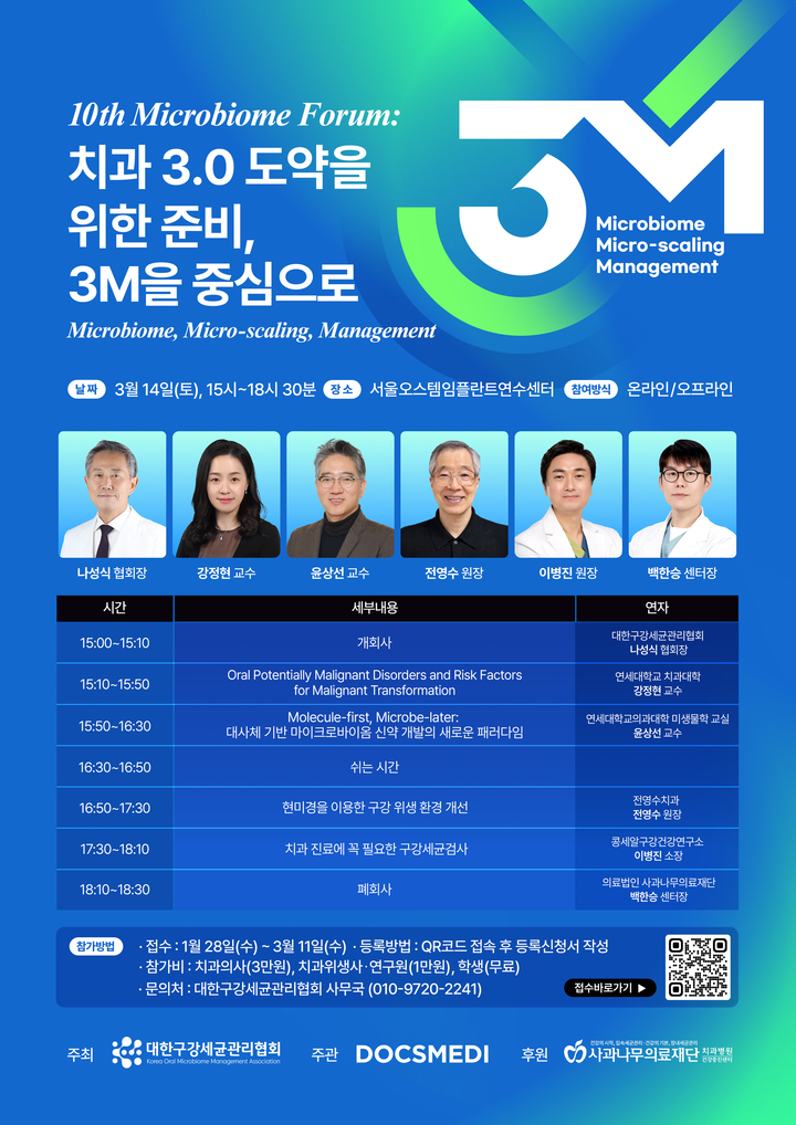 올해로 10회째를 맞는 이번 행사는 ‘마이크로바이옴 포럼’이라는 명칭을 확고히 하며, 지난 논의를 갈무리하고 미래 전략을 모색하는 자리로 마련된다. 이 소장은 그 핵심 전략으로 ‘3M(Microbiome, Micro-scaling, Management)’을 제시했다. 그는 “치과 3.0은 마이크로바이옴(Microbiome)에 대한 이해를 바탕으로 보다 정밀하고 조직 친화적인 스케일링(Micro-scaling)을 시행하며, 치료 후에도 지속적인 관리 체계(Management)를 이어가는 것이 핵심”이라고 설명했다.