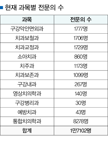 이번 시험을 포함해 정규시험 및 경과조치 등을 거쳐 배출된 전문의 수는 현재까지 총 1만7102명으로 확인됐다. 구체적으로 ▲구강악안면외과 1777명 ▲치과보철과 1706명 ▲치과교정과 1729명 ▲소아치과 860명 ▲치주과 1173명 ▲치과보존과 1099명 ▲구강내과 267명 ▲영상치의학과 140명 ▲구강병리과 30명 ▲예방치과 43명 ▲통합치의학과 8278명이다.