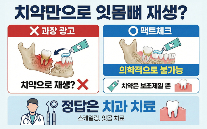 실제로 현재 시중에 판매되는 잇몸 치약 중 식품의약품안전처(식약처)로부터 ‘치아 주위 조직의 재생’ 효능으로 허가받은 제품은 단 하나도 존재하지 않는다고 학회 측은 밝혔다. 학회는 “한 번 녹아내린 잇몸뼈는 단순히 약을 바르거나 치약으로 닦는다고 해서 다시 자라나지 않는다”고 설명했다.