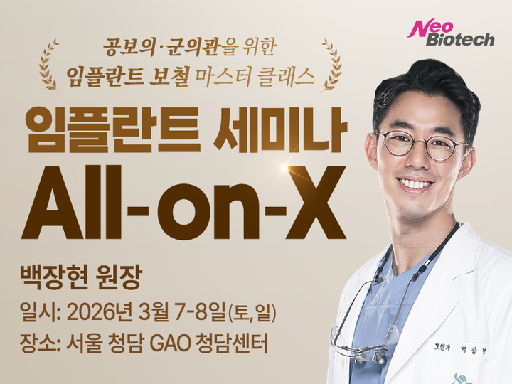 네오는 오는 7일(토)부터 8일(일)까지 서울에 위치한 청담 GAO 세미나실에서 임플란트 식립 기초 과정부터 고급 술식까지 체계적으로 학습할 수 있는 ‘All-on-X 임플란트 세미나’를 개최한다고 밝혔다.