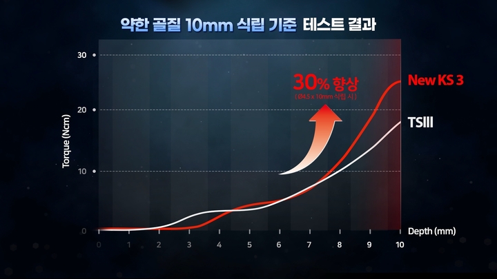 이러한 구조적 변화를 통해 테스트 결과 노멀 본 기준 기존 KSIII 대비 최종 식립 토크와 소프트 본 환경에서의 토크가 각각 약 31%, 30% 증가한 수치를 기록했다. 발치와 4mm 조건 시험에서도 약 36% 향상된 고정력을 보이는 등 즉시 임시보철 연결을 포함한 치료 계획 수립 시에도 강점이 있다.
