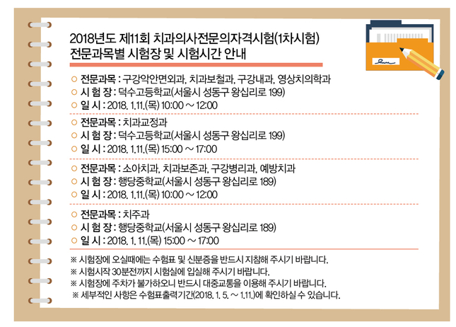 오는 11일 치러지는 제11회 치과의사전문의자격시험(이하 전문의시험)은 기수련자 경과조치 및 외국수련자 지원이 허용되는 첫 시험이다. 이 때문에 매년 평균 300여명의 전공의가 응시하던 시험에 올해는 총 2643명이 몰렸다. 이 같은 경과조치 대상자 응시는 오는 2022년 전문의시험까지 계속된다. 이와 관련 치의신보에서는 개원가 회원들의 궁금증을 즉각 반영해 Q&A 형식으로 연속해 보도할 계획이다. 첫 번째는 제11회 전문의시험에 대한 궁금증을 다뤘다<편집자주>.