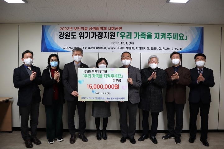 강원도보건의료상생협의체는 통합위기지원사업 ‘우리가족을 지켜주세요’ 기부금 전달식을 지난 1일 강원도 사회복지협의회 소회의실에서 가졌다. 이날 협의체를 구성하는 변웅래 강원지부장과 김택우 강원도의사회장, 오명균 강원도한의사회장 등 지역 6개 의약단체와 국민건강보험공단 서울강원지역본부가 공동모금한 1500만 원을 홀트아동복지회에 기부했다.