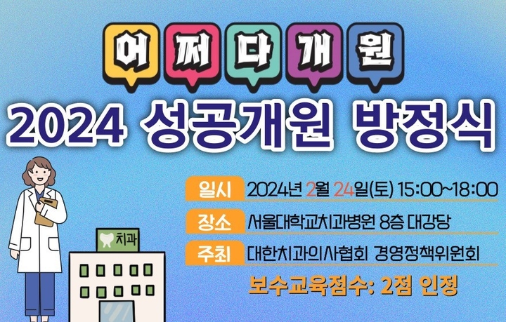 치협은 오는 2월 24일(토) 오후 3시부터 6시까지 3시간 동안 서울대치과병원 8층 대강당에서 ‘2024 성공개원 방정식-어쩌다 개원’(이하 성공개원 방정식) 세미나를 개최한다.