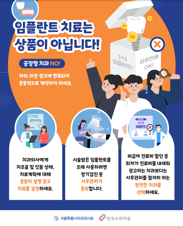 이번 캠페인은 '임플란트 치료는 상품이 아닙니다'라는 표어와 함께 임플란트 치료 시 반드시 알아야 할 주의사항을 알기 쉽게 포스터로 제작해 서울 주요 지하철역 등에서 홍보할 예정이다. 의료소비자가 공장형 치과에 대해 경각심을 갖고 사후관리를 철저히 하는 치과를 선택할 것과 시술받은 임플란트를 오래 사용하기 위한 구강위생과 정기검진의 중요성을 강조한다.