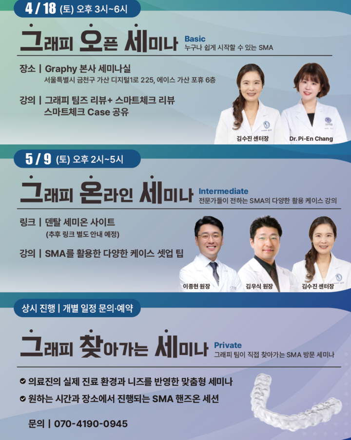 김수진 그래피 임상연구교육센터장은 “그래피는 단순한 기술 소개를 넘어 실제 임상에서 바로 적용 가능한 세미나 프로그램을 통해 의료진의 도입과 활용을 지원하는 데 초점을 맞추고 있다”며 “향후에도 SMA 기반 디지털 교정의 실제 임상 적용 확산을 위해 관련 프로그램과 지원 체계를 지속 확대해 나갈 계획”이라고 밝혔다. 온·오프 세미나 문의: 070-4133-4200