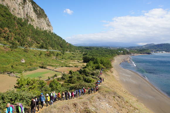 바람 많고 돌 많은 제주도 돌담 사잇길을 걷고, 자칫 검은 물개로 착각하기 쉬운 해녀들의 물질하는 모습이 심심찮게 눈에 든다. 해녀 잠수복과 태왁이 빛바랜 담벼락에 걸려 바닷바람에 펄럭이는 모습은 고단한 섬주민의 생활이 우리 어머니의 모습인 듯하여 가슴 한편이 짠해지기도 한다. 여기에 10코스에 있는 섯알오름 위령탑과 알뜨르비행장을 지날 때는 근대역사 속에서 겪은 제주도의 크나큰 상처로 걷는 이의 마음도 아려온다.