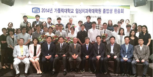 가톨릭대 임상치과학대학원(대학원장 박재억)은 지난 7월 17일 서울 팔래스호텔에서 졸업생 환송회를 열어 2014년도 졸업생을 축하하는 자리를 마련했다. 졸업생은 교정학 6명, 구강악안면외과학 5명. 임플란트학 2명, 보존보철학 1명으로 총 14명이다.환송회에는 박재억 대학원장을 비롯 국윤아 가톨릭대 치과학교실 주임교수 등 대학원 교수진과 재학생, 졸업생들이 참여해 사제간의 정을 나눴다.