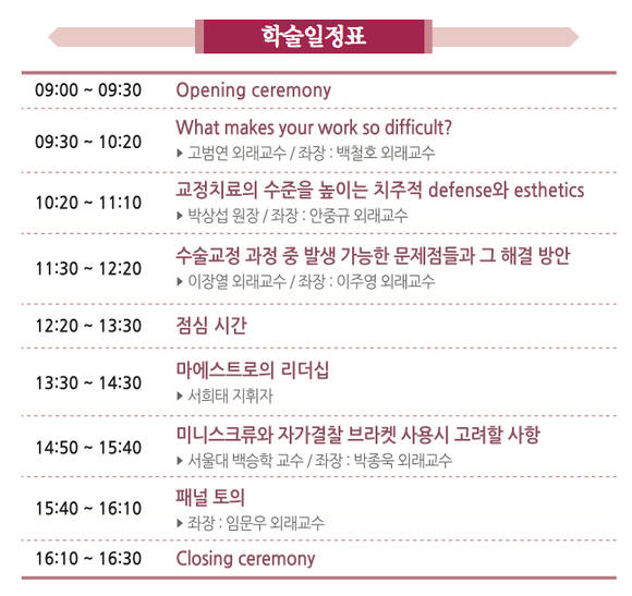 ‘교정 치료 중 발생하는 위기와 극복: 빈발하는 문제들과 해결 방법 PartⅡ(Overcoming the crisis during orthodontic treatment PartⅡ)’를 대주제로 한 이번 심포지엄에서는 임상가들이 교정치료를 진행하는 과정에서 궁금증을 해결해 주는데 학술프로그램 구성의 초점을 맞췄다.