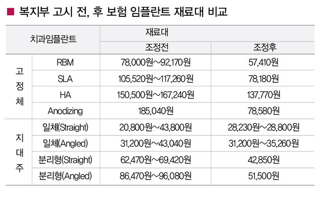 이번 개정 고시를 통해 복지부는 임플란트 고정체, 임플란트 지대주 일체의 재료대 상한금액을 40% 가량 하향하는 직권조정을 단행했다.