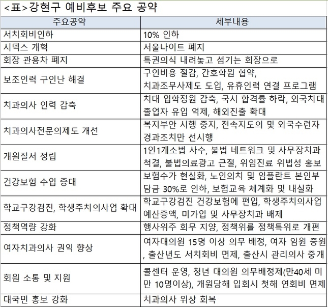 강현구 서울지부 회장 예비후보가 ▲서치회비 인하 ▲시덱스 서울나이트 폐지 ▲회장 관용차 폐지 등 1차 공약을 공개한데 이어 여자치과의사와 젊은 치과의사 등 회원들의 표심을 잡기 위한 공약을 발표했다.