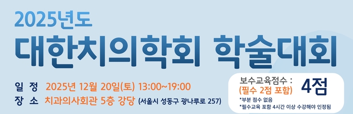 대한치의학회(이하 치의학회)는 오는 20일 치협 회관 5층 대강당에서 ‘2025년도 치의학회 학술대회’를 개최한다.