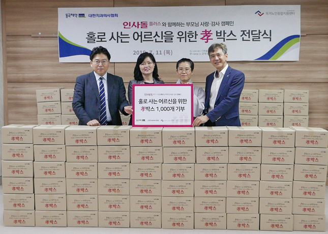 치협과 동국제약은 ‘인사돌플러스와 함께하는 부모님 사랑·감사 캠페인’을 통해 적립한 ‘효(孝) 박스’ 1000개를 독거노인종합지원센터에 기부하는 전달식을 최근 진행했다.