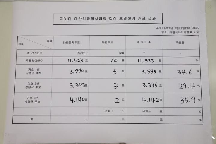 7월 12일 총 선거권자 1만6837명 중 1만1533명이 투표에 참여해 68.5%의 최종 투표율을 보인 가운데 치러진 제31대 회장 보궐선거 개표 결과 ▲기호 1번 장영준 후보가 3995표(34.6%) ▲기호 2번 장은식 후보가 3396표(29.4%) ▲기호 3번 박태근 후보가 4142표(35.9%)를 득표해 세 후보 모두 과반수 획득에 실패했다.