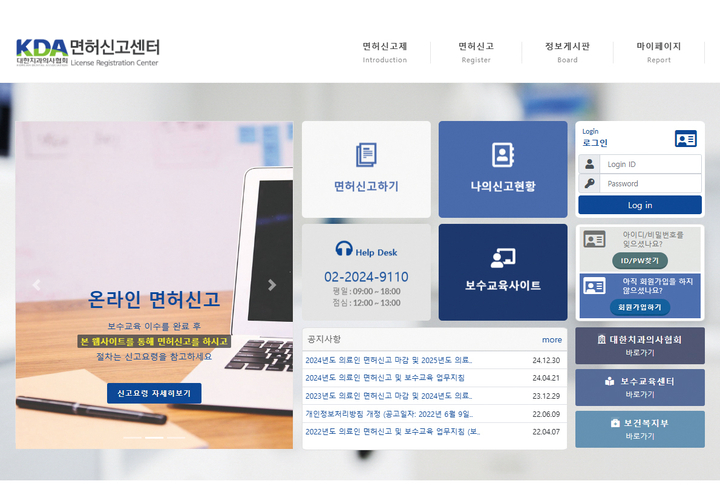 ▲면허신고는 면허신고센터(http://license.kda.or.kr/)에 직접 접속해 실태 등 신고서를 제출하면 되며, ▲보수교육일정 확인 및 유예면제 신청 등은 보수교육센터(https://edu.kda.or.kr)를 통해 하면 된다.