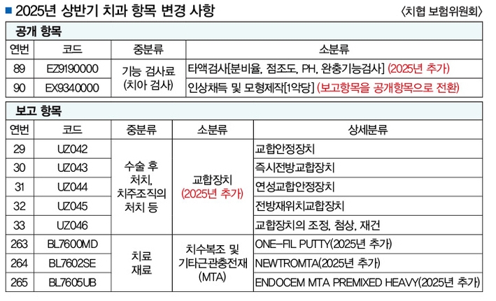 MTA는 기존 항목에 ▲ONE-FILPUTTY(BL7600MD) ▲NEWTROMTA(BL7602SE) ▲ENDOCEM MTAPREMIXED HEAVY(BL7605UB)가 신설 추가됐다. 이 밖에 삭제 항목은 ▲부분치수절단술(MTA이용, 4Z0E00013) ▲기타 부정교합의 고정식 포괄적 치과교정(2ZK300000)이다.