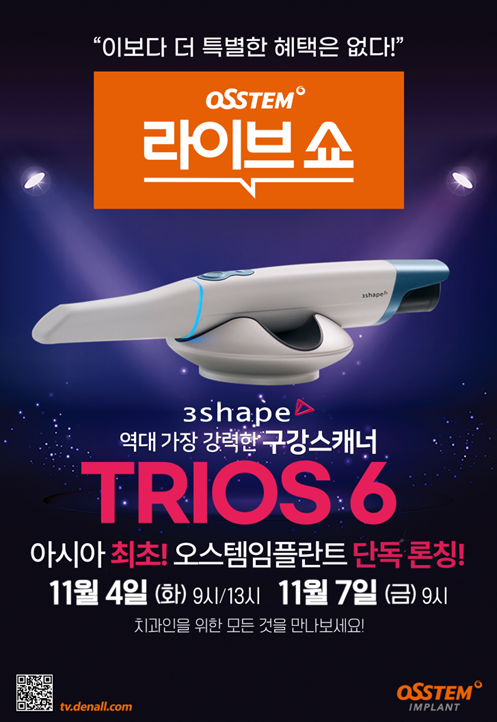 오스템 라이브쇼는 오는 4일 3shape사의 최신작 ‘TRIOS 6’(트리오스 6)의 아시아 최초 론칭 방송을 편성했다고 밝혔다. TRIOS 6는 지난 9월 ‘Osstem Meeting 2025 Seoul’ 사전 예약을 통해 국내 첫 공개된 제품이며 현존 가장 뛰어난 스캐너를 합리적인 가격에 구입할 수 있도록 기획해 일찍부터 많은 기대를 모으고 있다.