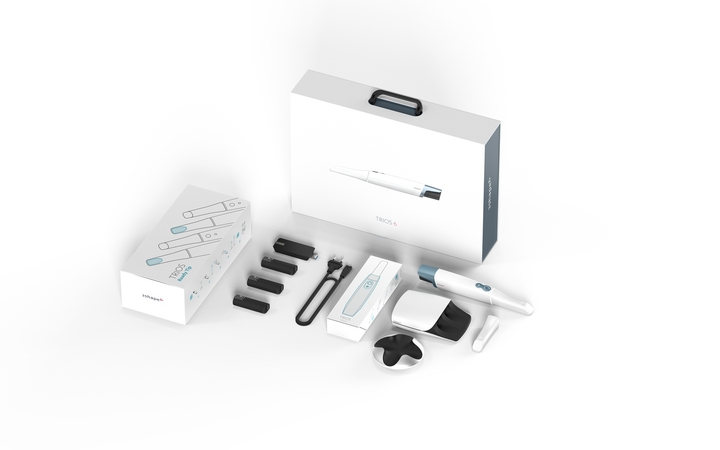 TRIOS 6의 구성품은 ▲TRIOS 6 본품 △교체용 배터리X3 ▲무선연결 리시버 ▲스캐너 거치대 ▲1회용 바디슬리브(1000개) ▲1회용 팁(25개) ▲충전기 ▲보호 커버 등이다.