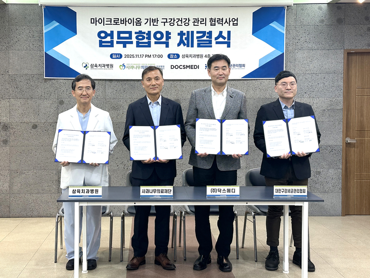이번 협약에 따라 삼육치과병원은 임상 연구 및 진료 모델 구축을, 사과나무의료재단은 병원 네트워크를 통한 프로그램 실증과 평가를 담당한다. 닥스메디는 구강 마이크로바이옴 검사 서비스 ‘오랄바이옴 체크’ 공급과 현장 교육을 맡고, 대한구강세균관리협회는 관련 전문가 교육 및 홍보를 추진한다.