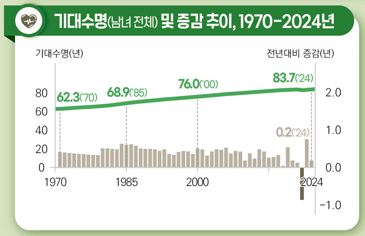 이를 살펴보면 2024년 출생아 기준 남녀 평균 기대수명이 83.7년으로 나타났다. 이는 전년도 대비 0.2년 증가한 수치며 10년 전과 대비해 보면 1.9년 증가한 수치다. 성별 기대수명을 확인해보면 남성이 80.8년, 여성이 86.6년으로 전년 대비 남녀 모두 0.2년 증가했다. 10년 전과 비교해보면 남성의 경우 2.2년, 여성의 경우 1.6년 늘었다.