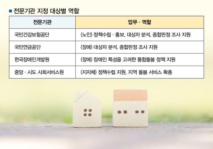 셋째, 시장·군수·구청장이 대상자의 의료적 지원 필요도 및 일상생활 요양·돌봄 필요도 등을 종합적으로 판정하기 위해 필요한 조사업무의 일부를 국민건강보험공단 또는 국민연금공단에 위탁한다.(시행령 제5조)