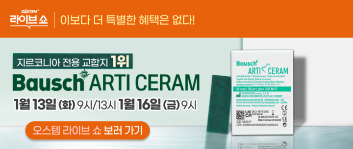 오스템 라이브쇼는 13일과 16일 바우쉬사의 지르코니아 전용 교합지 ‘아티세람’(Bausch ARTI CERAM) 방송을 진행한다.