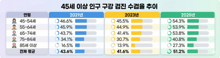 연령별 수검률에서는 고령일수록 낮아지는 경향이 뚜렷했다. 가장 높은 45~54세는 54.3%로 과반이 수검했으나, 이후 ▲55~64세 53.9% ▲65~74세 53.8% ▲75~84세 40.8%로 낮아지는 모습을 보였다. 특히 85세 이상은 27.3%로 급격히 하락했다.