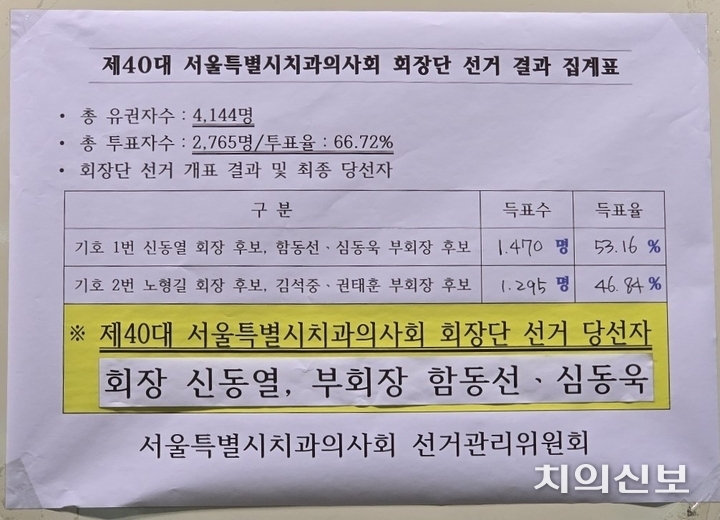 이번 제40대 회장 선거에 출마한 기호 1번 신동열 회장 후보, 함동선·심동욱 부회장 후보는 오늘(10일) 치협 회관에서 진행된 개표 결과 총 1470표(53.16%)를 얻어 제40대 서울지부 회장단에 당선됐다. 이는 1295표를 얻은 기호 2번 노형길 회장 후보, 김석중·권태훈 부회장 후보(46.84%)와는 175표 차이다.